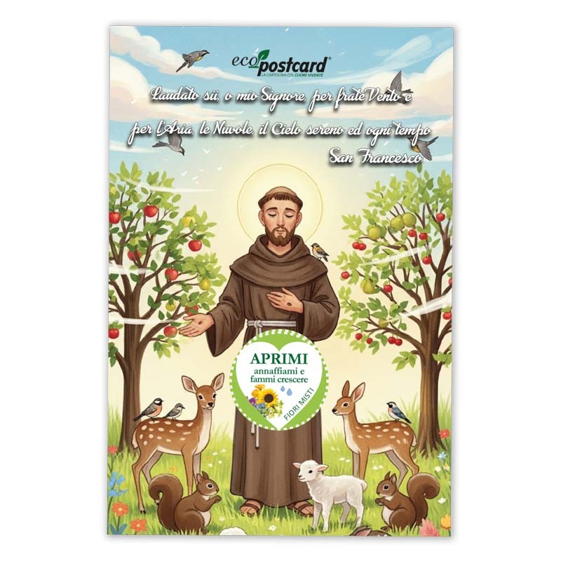 Una cartolina vivente dedicata a San Francesco e al suo Cantico delle Creature. Inquadra il QR con l’app URRÀ per ascoltare il canto “Laudato si’, o mio Signore, per frate Vento e per l’Aria, le Nuvole, il Cielo sereno ed ogni tempo”. All’interno semi di fiori misti che germogliano.