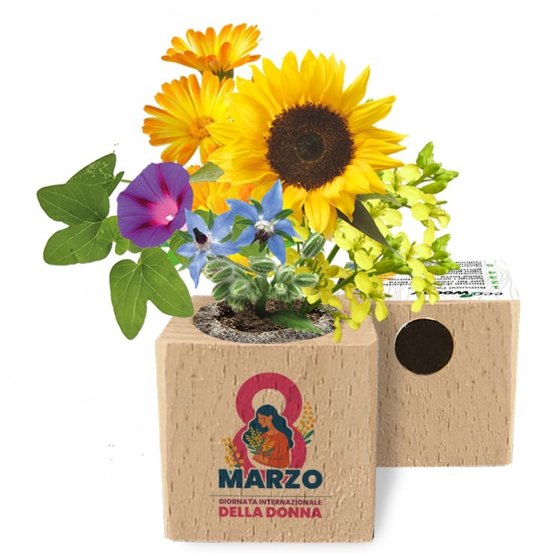 Eco-Woody® Festa della Donna è un gadget ecologico in legno, essenziale e bellissimo da tenere sulla scrivania, che contiene una cialdina di terra con semi di fiori misti: un augurio che non finisce in un cassetto, ma cresce.