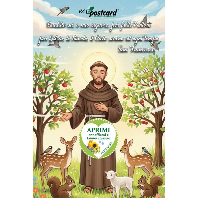 Una cartolina vivente dedicata a San Francesco e al suo Cantico delle Creature. Inquadra il QR con l’app URRÀ per ascoltare il canto “Laudato si’, o mio Signore, per frate Vento e per l’Aria, le Nuvole, il Cielo sereno ed ogni tempo”. All’interno semi di fiori misti che germogliano.